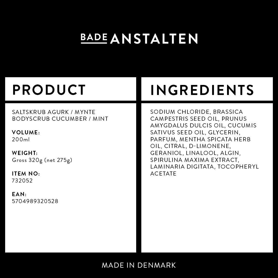 Läcker saltskrubb med havssalt, gurkfröolja och en fräsch touch av mynta. Gurkfröolja är extremt effektiv vid behandling av torr hud, då oljan är rik på essentiella fettsyror som hjälper till att upprätthålla hudens fuktbalans, mjukhet och smidighet. Dessutom är skrubben även tillsatt olja från mandel och raps som båda har fantastiska återfuktande egenskaper. Skrubben tar bort döda hudceller och stimulerar blodcirkulationen, vilket gör huden mjuk och läcker. Det är ren självnjutning på burk! Använd vår vackra kroppsskrubb till både dusch och bad när huden behöver skämmas bort lite extra.