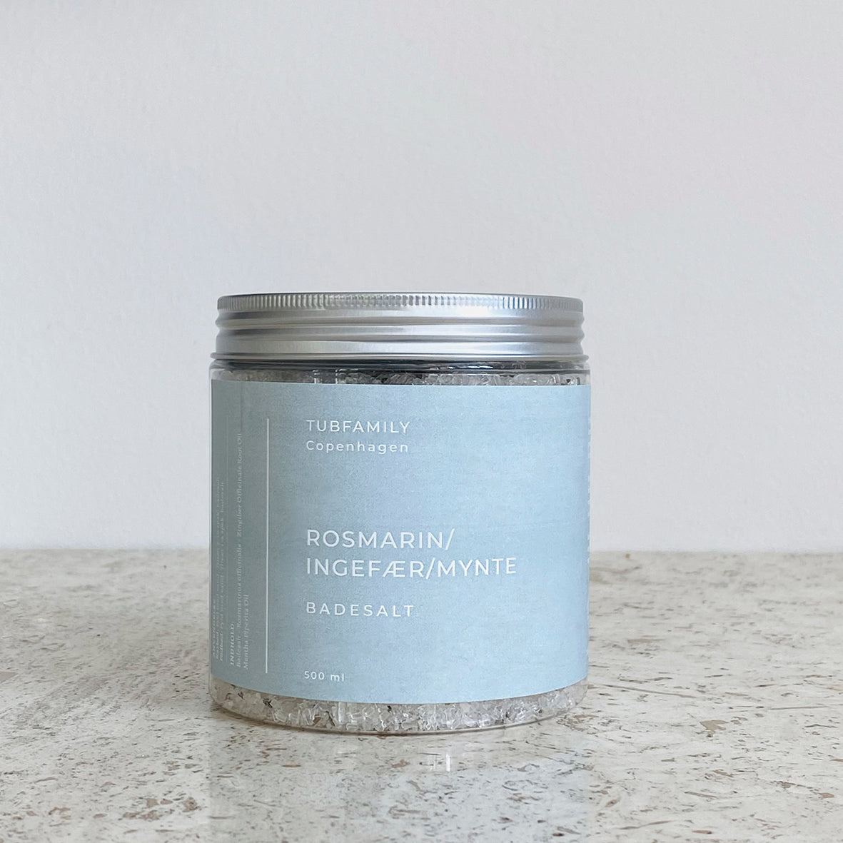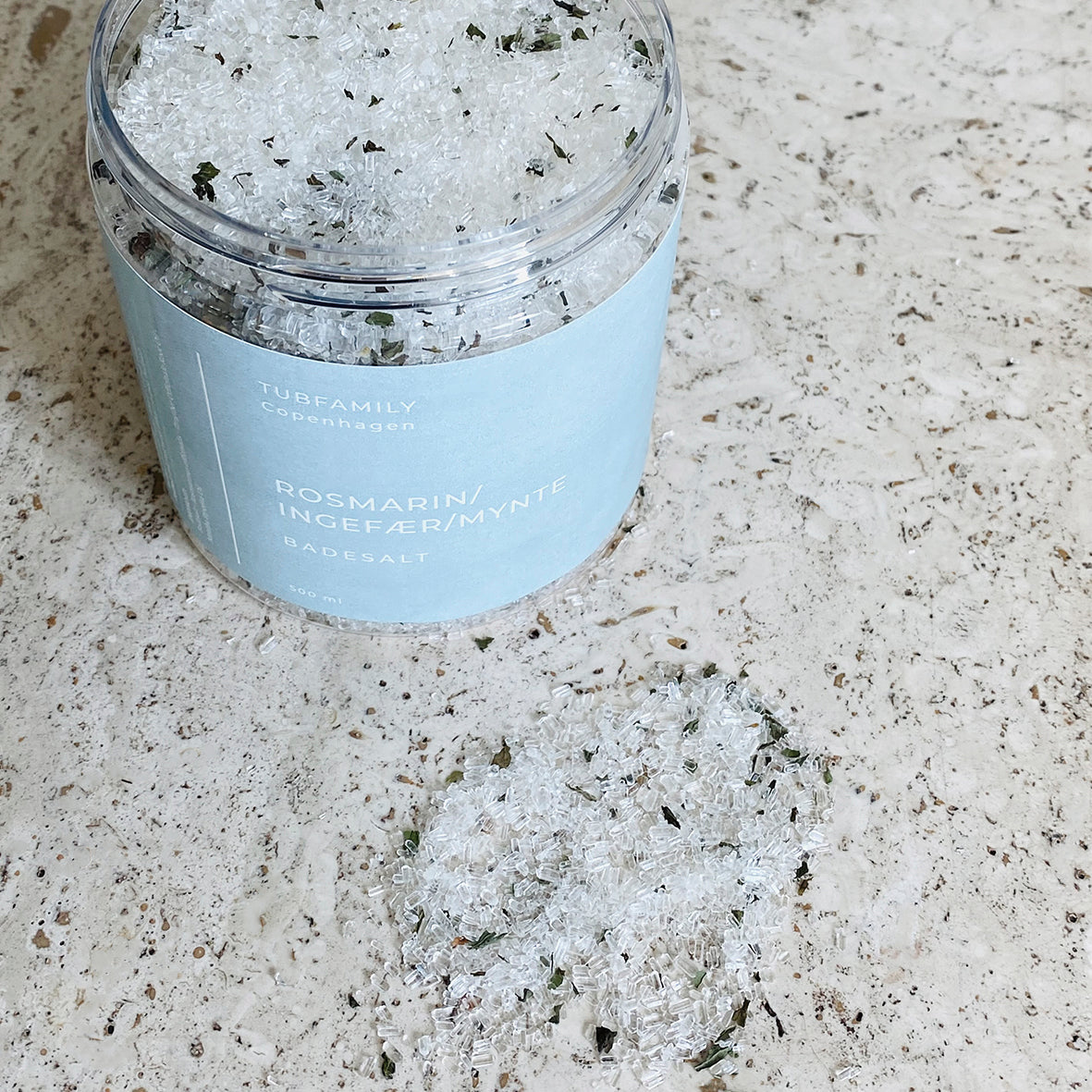 Badsaltet innehåller eteriska oljor från rosmarin, ingefära & mynta, och torkade myntablad, som ger energi och en fräsch doft.