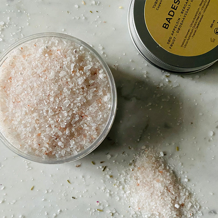 Badsaltet innehåller naturligt Dödahavssalt & Himalayasalt, ekologiska eteriska oljor från söt apelsin, bergamott & grapefrukt