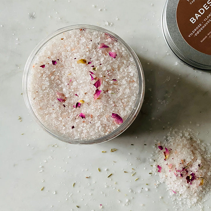 Badsaltet innehåller naturligt Dödahavssalt & Himalayasalt, ekologiska eteriska oljor från ylang-ylang, vildros & apelsin och torkade ekologiska rosenblad.